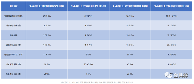 4、投票权委托。例如京东(JD纳斯达克)。刘强东团队上市前股权比例为23%,但老虎基金、腾讯、高瓴资本、今日资本等11家投资人将其投票权委托给了刘强东团队行使。上市后,刘强东团队虽然持股20%却拥有了83.7%的投票权,具体如下表格所示。